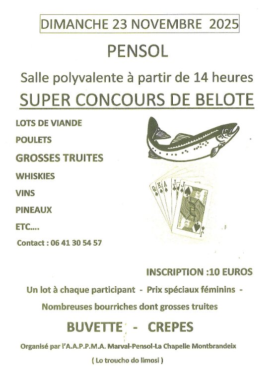 Rendez‑vous à Pensol pour le Super Concours de Belote, dimanche 23 novembre 2025 à partir de 14h, à la salle polyvalente ♠️♦️.