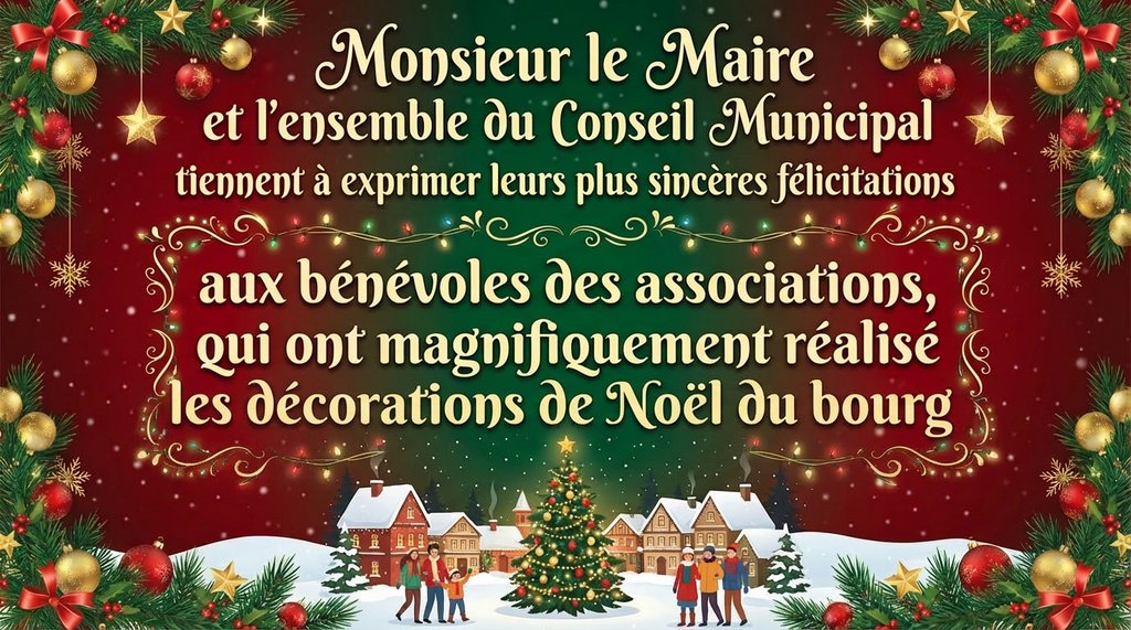 Monsieur le Maire et l'ensemble du Conseil Municipal tiennent à exprimer leurs plus sincères félicitations aux bénévoles des associations qui ont magnifiquement réalisé les décorations de Noël du bourg.