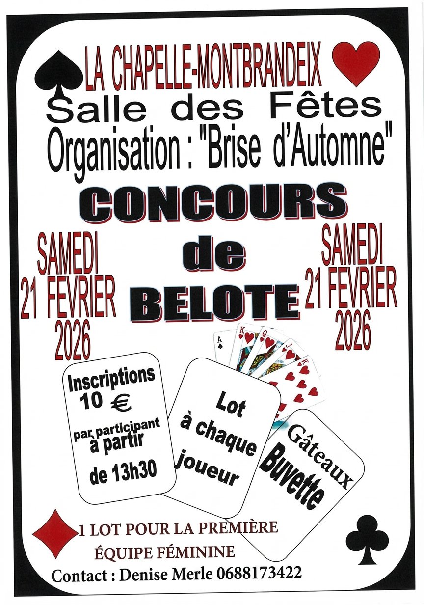 La Salle des FĂȘtes de La Chapelle-Montbrandeix accueille un concours de belote convivial, organisĂ© par lâassociation Brise dâAutomne. Rendez-vous samedi 21 fĂ©vrier 2026 pour une aprĂšs-midi placĂ©e sous le signe du jeu et de la bonne humeur â ïžâ„ïž