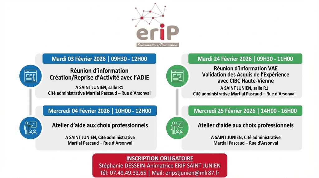 - Le mardi 03 février 2026 de 09H30 à 12H00 : une réunion d’information sur la création /reprise d’activité avec la participation de l’ADIE - A SAINT JUNIEN, salle R1 Cité administrative Martial Pascaud – Rue d’Arsonval