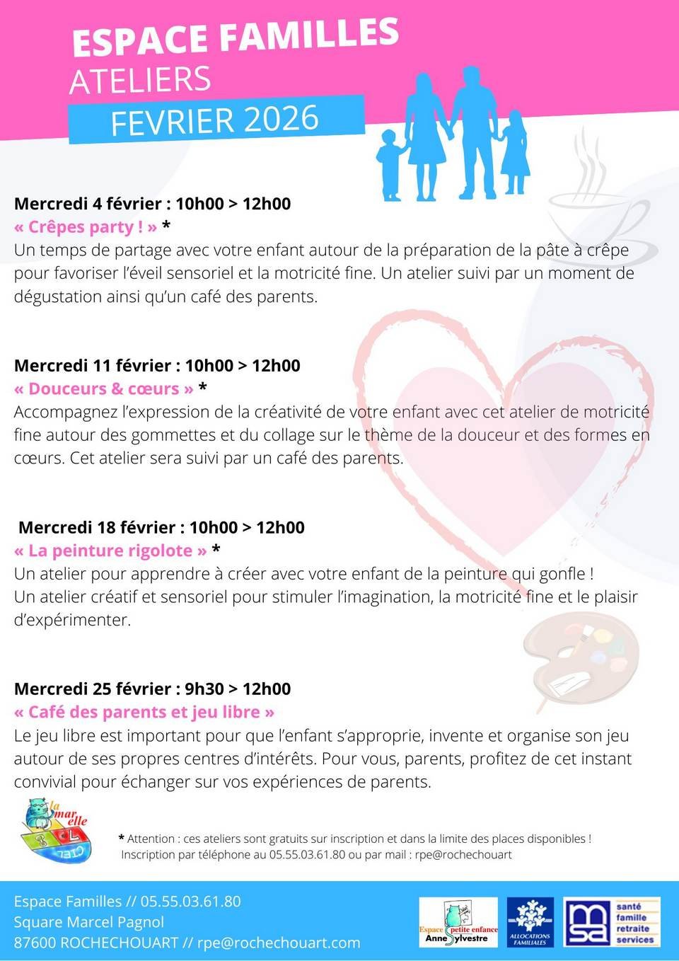 En février, l’Espace Familles de Rochechouart vous invite à vivre des instants magiques avec vos enfants ! 🧑🍳 Crêpes party le 4, ❤️ Douceurs & cœurs le 11, 🎨 Peinture rigolote le 18… Et le 25, un café des parents pour échanger en toute convivialité.