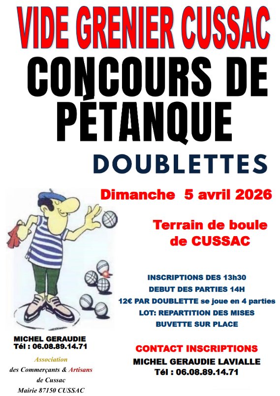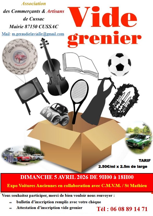 L'association des commerçants et artisans de Cussac organise de 9h à 18h le dimanche 5 avril prochain un vide-grenier dans le bourg.