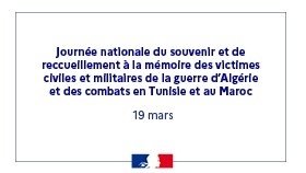 Jeudi 19 mars 2026, la commémoration du 19 mars 1962 se déroulera à 11h30 au monument aux morts.