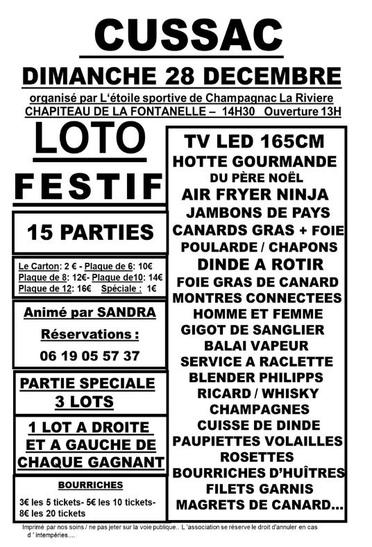 L'étoile sportive de Champagnac la Rivière organise le dimanche 28 décembre un loto au Chapiteau de la Fontanelle de Cussac 14h30.