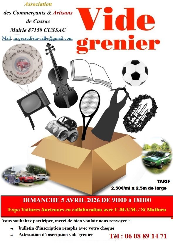 L'association des commerçants et artisans de Cussac organise de 9h à 18h le dimanche 5 avril prochain un vide-grenier dans le bourg.