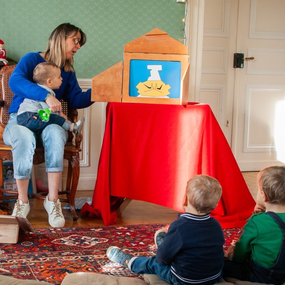 On écoute les histoires et on chante tous ensemble, avec toutes sortes de supports (le kamishibaï, le tapis de lecture, des marionnettes, des objet, des instruments de musique, etc.)