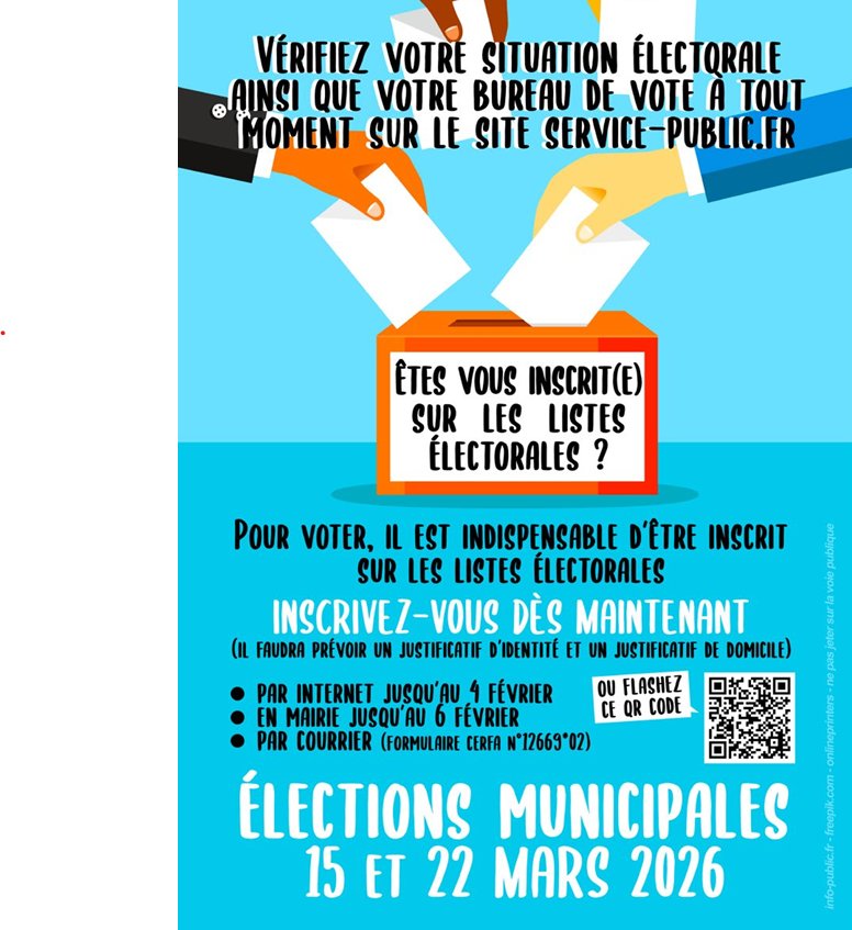 - L'inscription sur les listes électorales est possible jusqu'au 4 février 2026 en ligne et jusqu'au 6 février 2026 en Mairie. inscription sur le lien N°1