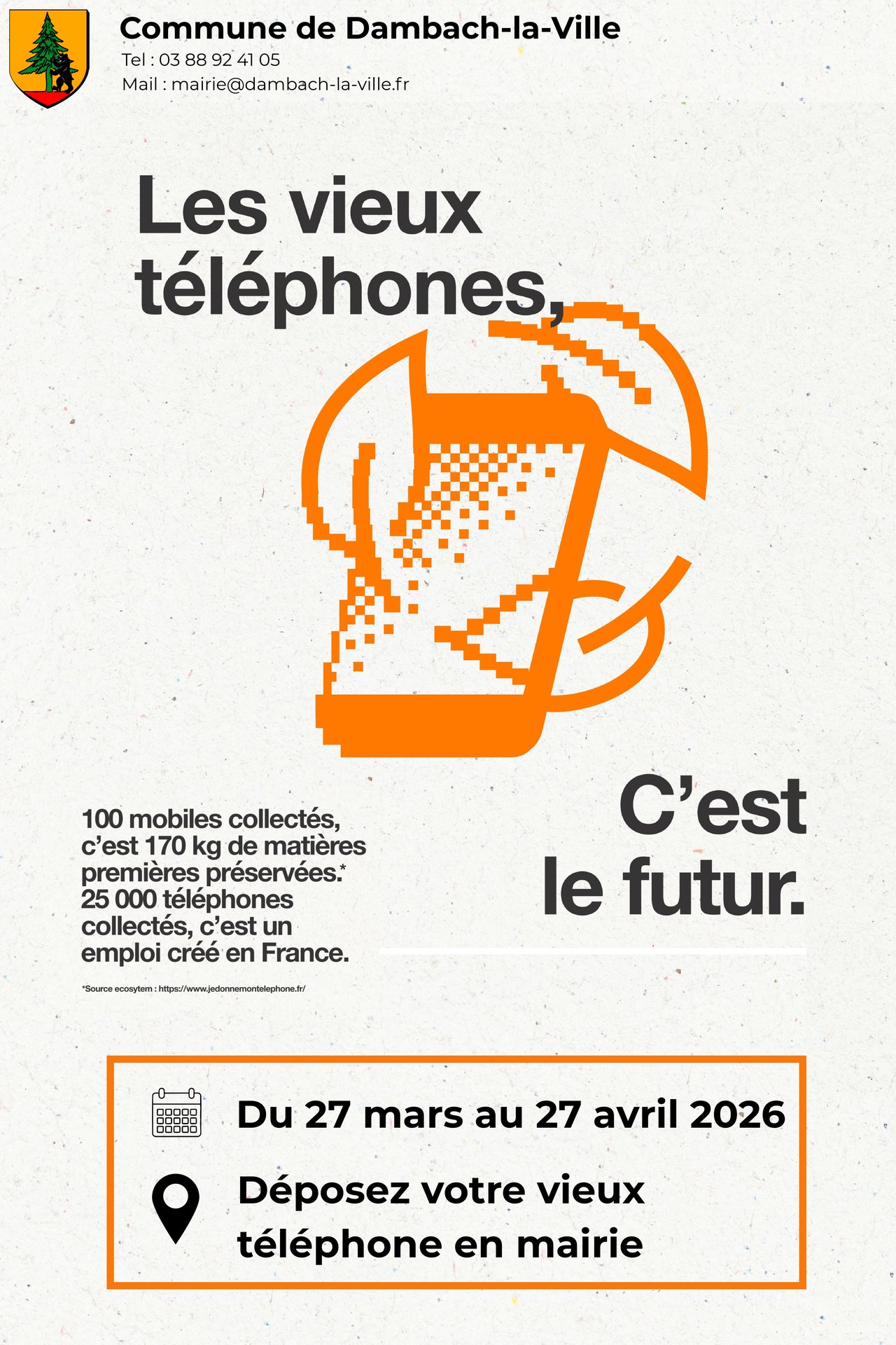 Dans le cadre de l’opération Oschterputz – Nettoyage de printemps à l’alsacienne, la Commune de Dambach-la-Ville participe au challenge de collecte de mobiles usagés organisé en partenariat avec Orange.