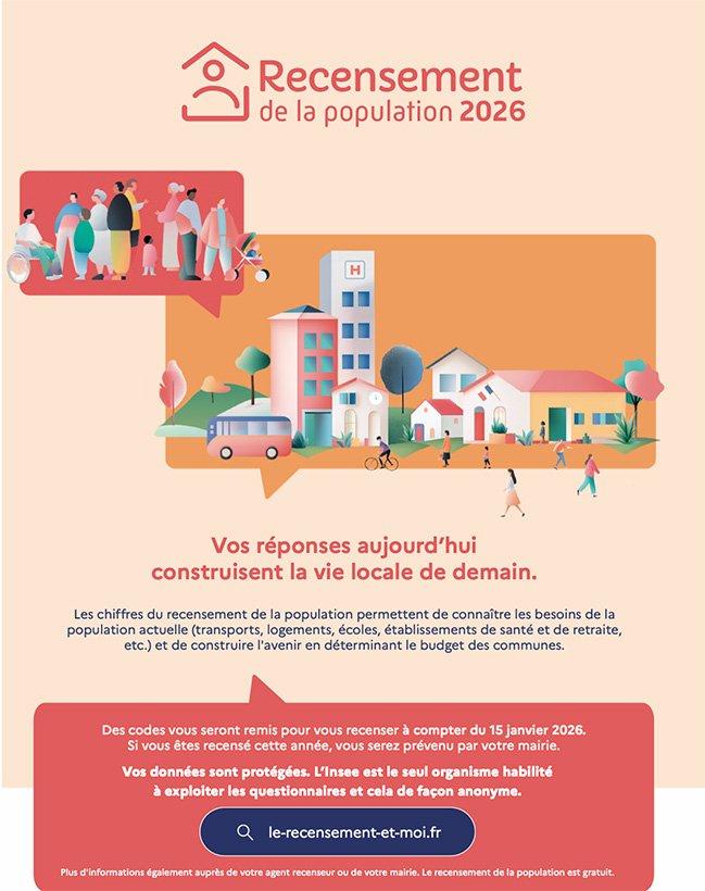Dès janvier 2026, la commune réalisera le recensement de sa population pour mieux connaître son évolution, ses besoins et ainsi développer de petits et grands projets pour y répondre. Une partie des logements et des habitants seront recensés à partir du 15 janvier 2026.