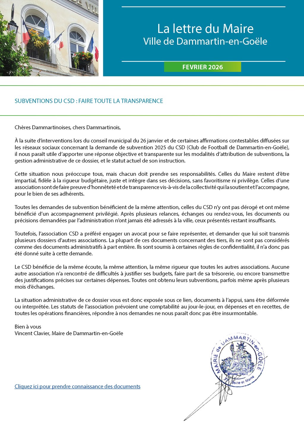 LA LETTRE DU MAIRE - SUBVENTIONS DU CSD : FAIRE TOUTE LA TRANSPARENCE