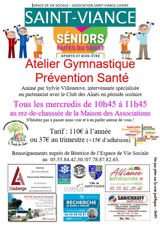 Venez dĂ©couvrir notre atelier Gymnastique â PrĂ©vention SantĂ©, animĂ© par Sylvie Villeneuve, intervenante spĂ©cialisĂ©e, en partenariat avec le Club des AĂźnĂ©s (pĂ©riode scolaire).