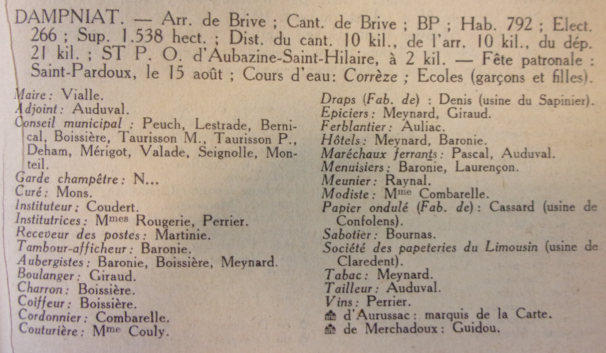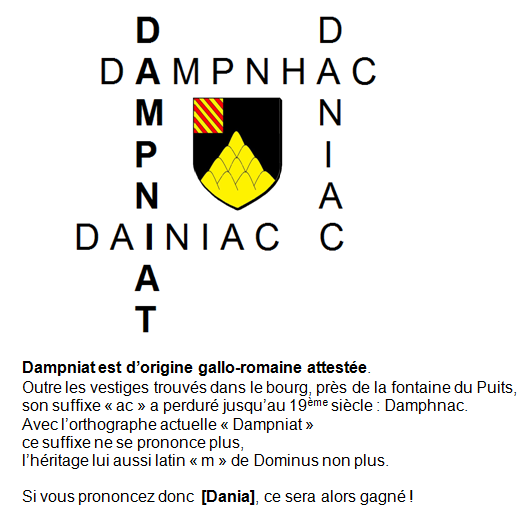 "...Dampniat est une commune rurale en Corrèze. Cette définition et les chiffres qui l'accompagnent sur les registres administratifs ne permettent pas à eux seuls de comprendre Dampniat. Une commune rurale ne se résume pas à un plan cadastral, aux résultats d'un recensement, ni même aux jolis paysages qui encadrent un bourg rassemblé autour de son église. Une commune rurale est avant tout l'Histoire collective que tissent chaque jour ses habitants, depuis des siècles parfois; depuis le jour lointain où l'un de leurs ancêtres s'est arrêté sur ce coin de colline et a décidé d'y vivre.