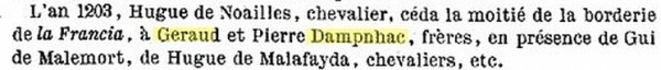 Vers 1250, Pierre de Malemort acquiert d'Hélie Lapiec et Hugues son frère tout ce qu'ils ont dans la borderie de Dampniaco, ce en présence de Pierre de Malefayde.