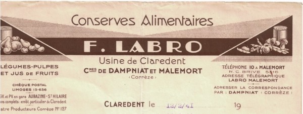Entête de facture de l'usine Labro/1941