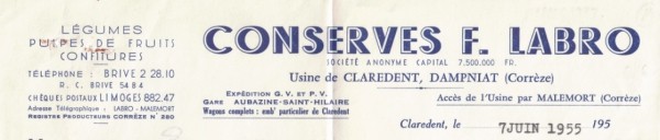 Erratum: Fernand Labro a eu 2 filles: Jacqueline et Yvette. Jacqueline a épousé Jacques Cassard, petit-fils du fondateur de l'usine Gaston Cassard,