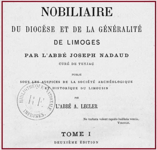 LE NOBILIAIRE DE LA GENERALITE DE LIMOGES DE L'ABBE JOSEPH NADAUD, 1862-1972