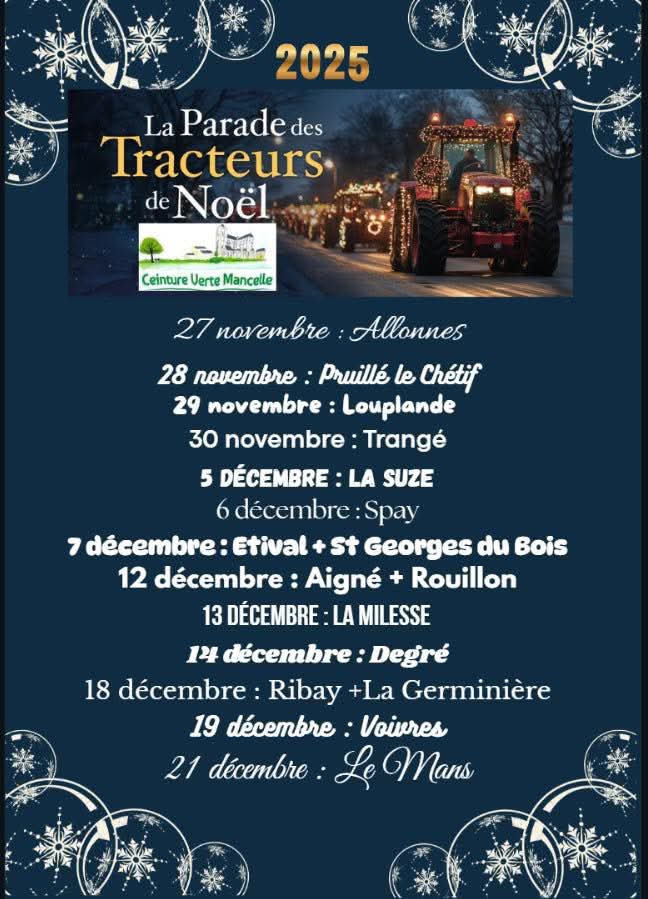 Parade des tracteurs illuminés de la Ceinture Verte Mancelle de passage dans notre Village.