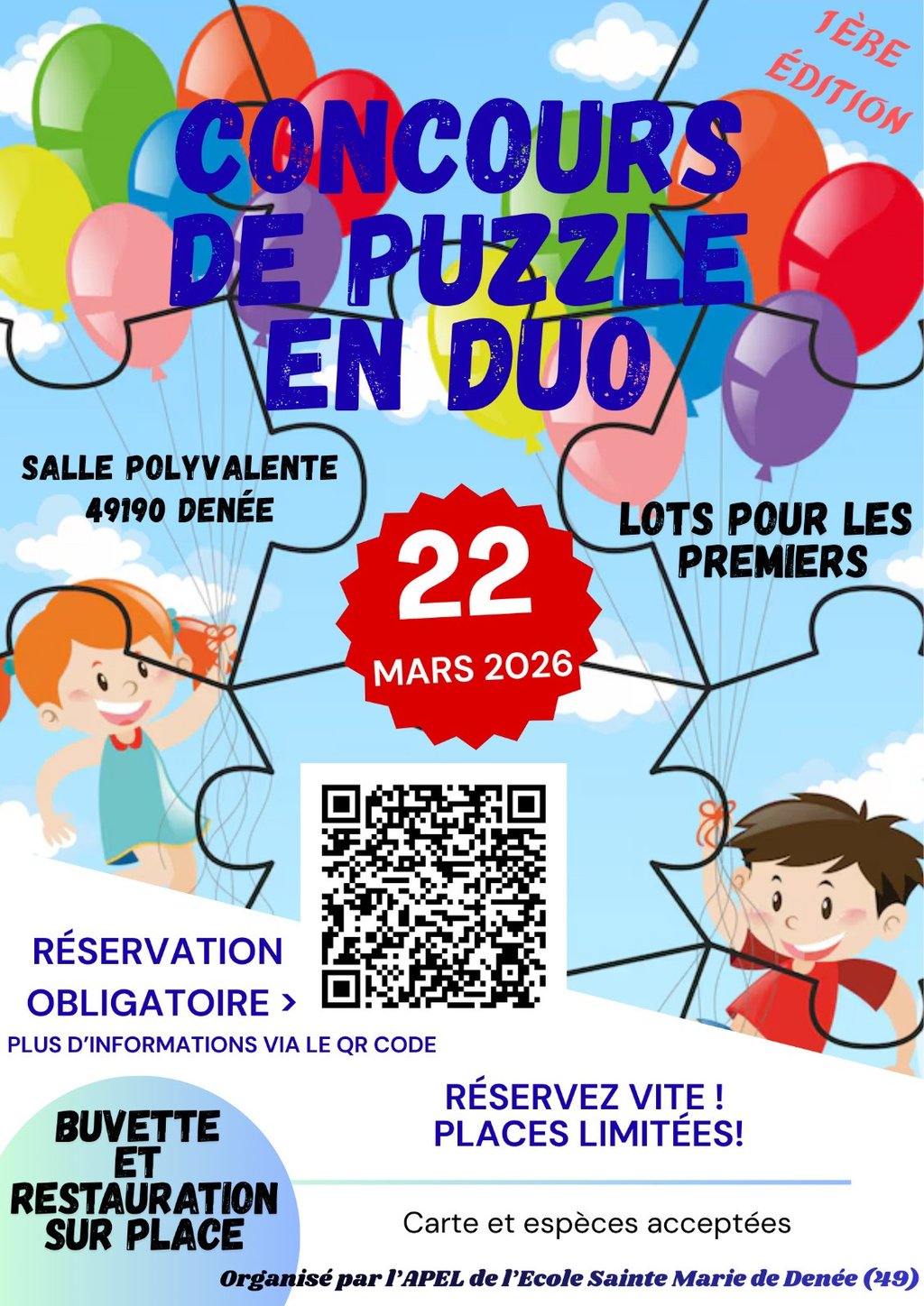 Venez participer à la première édition du concours de puzzle organisé par l’Apel de l’école sainte marie de denée. En duo affrontez d’autres équipes et soyez les plus rapides à réaliser votre puzzle ! Passionnés ou simplement amateurs, venez passer un moment convivial en famille ou amis. Chaque équipe repartira avec son puzzle.