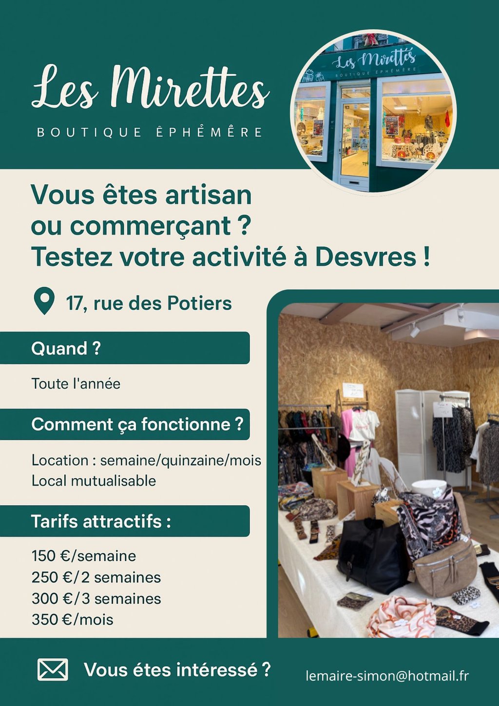 Nous sommes impatients de découvrir vos projets et de voir notre centre-ville s’animer grâce à vos talents et à votre créativité. À très bientôt dans notre Boutique éphémère - Les Mirettes !