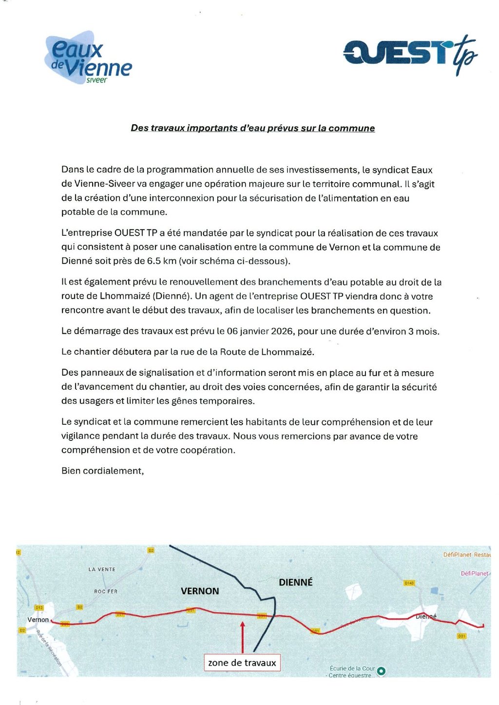 Le syndicat EAUX DE VIENNE va engager une opération majeure sur notre commune : interconnexion pour l'alimentation en eau potable de la commune. L'entreprise va mener les travaux : pose d'une canalisation entre Vernon et notre commune de près de 6.5 kms !!