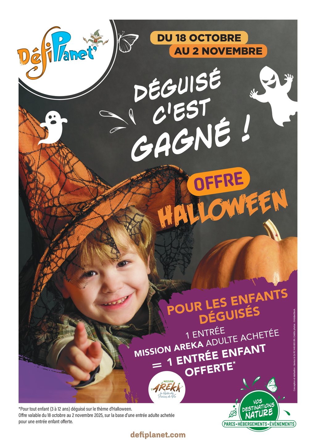 Une entrée adulte Mission Areka achetée = une entrée enfant offerte (5 à 12 ans) si l’enfant est déguisé sur le thème d’Halloween.