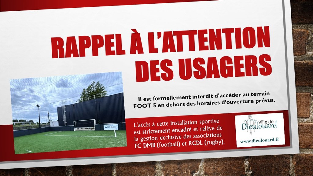🔒 Rappel à l’attention des usagers. Il est formellement interdit d’accéder au terrain FOOT 5 en dehors des horaires d’ouverture prévus.