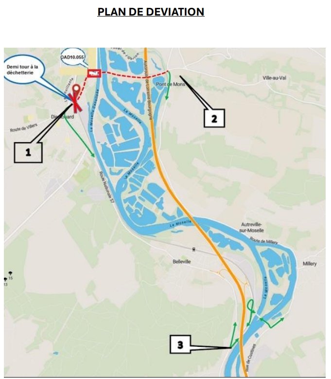 Le jeudi 20 novembre 2025, de 08h30 à 17h30, la RD10 sera totalement fermée à la circulation entre Dieulouard et Le Pont de Mons, au niveau de la déchetterie.