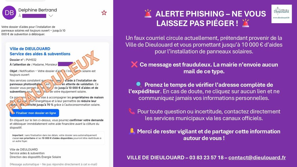 Attention, nous avons été alertés par des administrés. Un faux courriel circule actuellement, prétendant provenir de la Ville de Dieulouard et vous promettant jusqu’à 10 000 € d’aides pour l’installation de panneaux solaires.