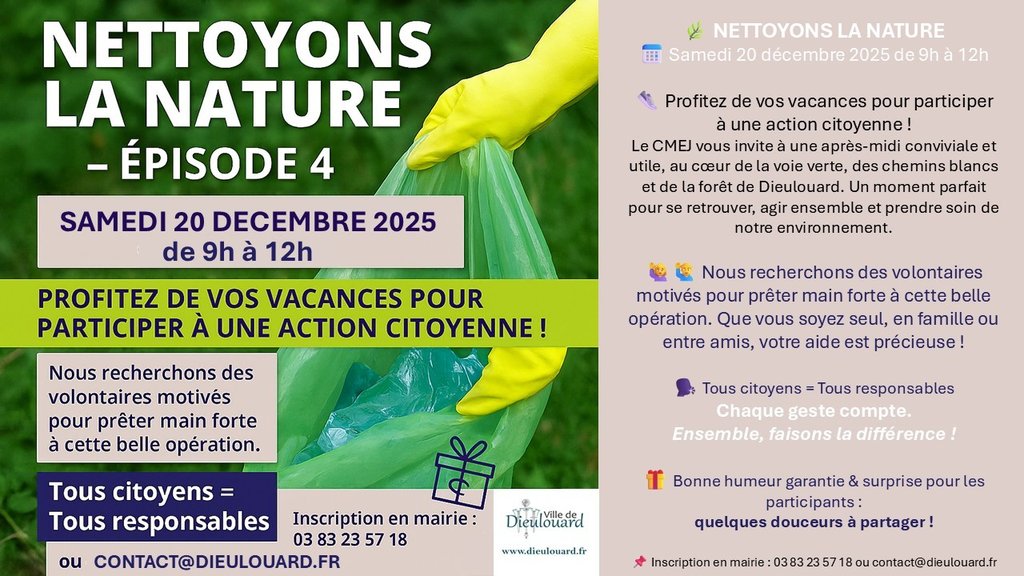 [17/12/2025] L’opération « Nettoyons la Nature » prévue le 20 décembre est annulée et reportée à une date ultérieure, en raison d’un nombre insuffisant de participants.