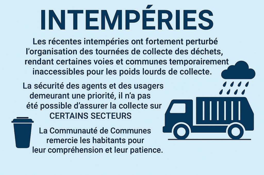 En raison des conditions météorologiques annoncées cette semaine, des perturbations importantes vont survenir dans la collecte des déchets sur le territoire.