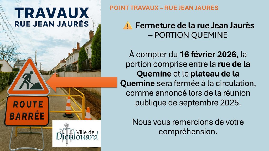 Les travaux sur la portion de la rue Jean Jaurès allant de la rue de la Quemine au plateau de la Quemine ont débuté conformément aux informations transmises lors de la réunion publique de septembre 2025.