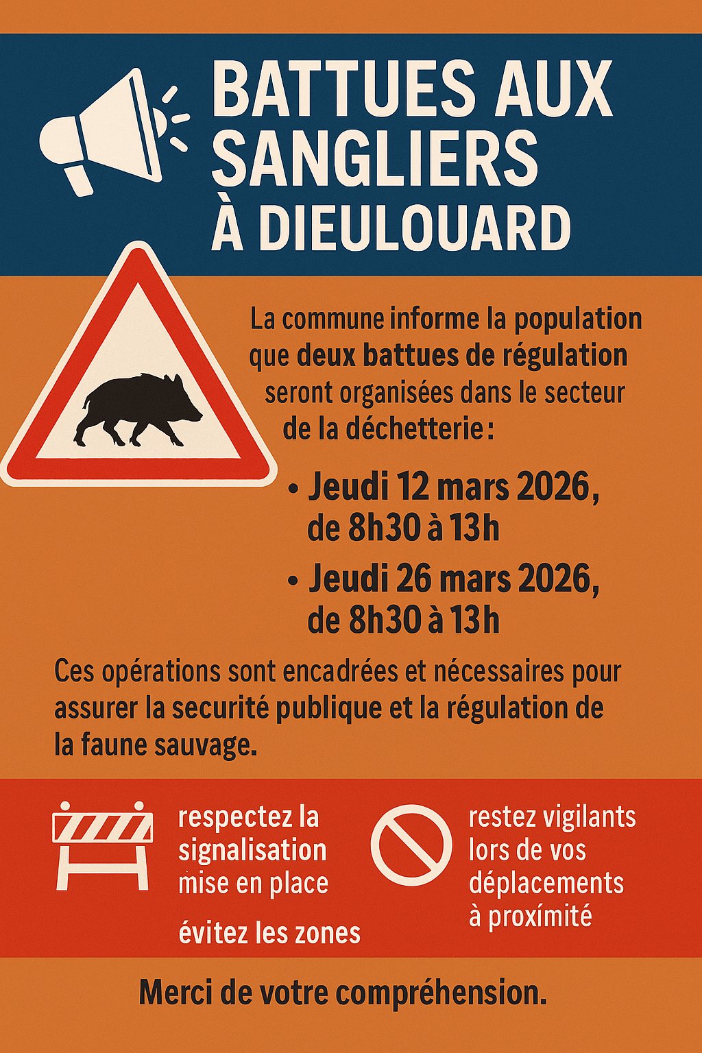 La commune informe la population que deux battues de régulation seront organisées par l'ACCA de Dieulouard dans le secteur de la déchetterie :