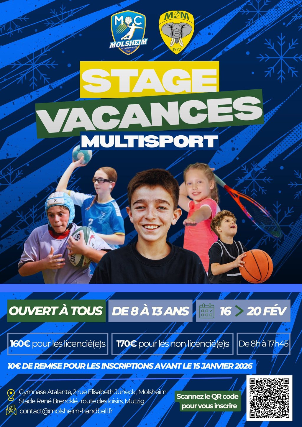 Le Mutzig Ovalie Molsheim đ sâassocie au Molsheim Olympique Club Handball đ€Ÿââïž pour proposer Ă vos enfants de 8 Ă 13 ans un stage multisport pendant les vacances d'hiver, du 16 au 20 fĂ©vrier.