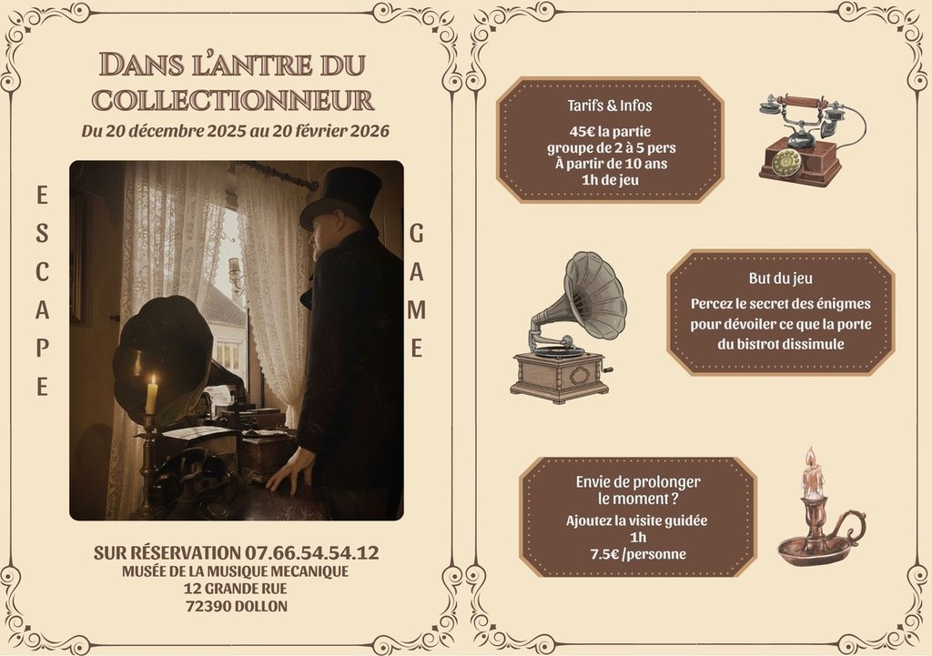 Dans l'atelier de notre collectionneur passionné, une aventure hors du commun vous attend. Oserez-vous découvrir un trésor exceptionnel : une collection fascinante de boîtes à musique, accordéons automatiques et orgues de barbarie ? Chaque objet cache une histoire ancienne et un secret à dévoiler. Mais attention, le collectionneur a mystérieusement disparu en voyage, laissant sa précieuse collection dissimulée à l'arrière d'un bistrot.
