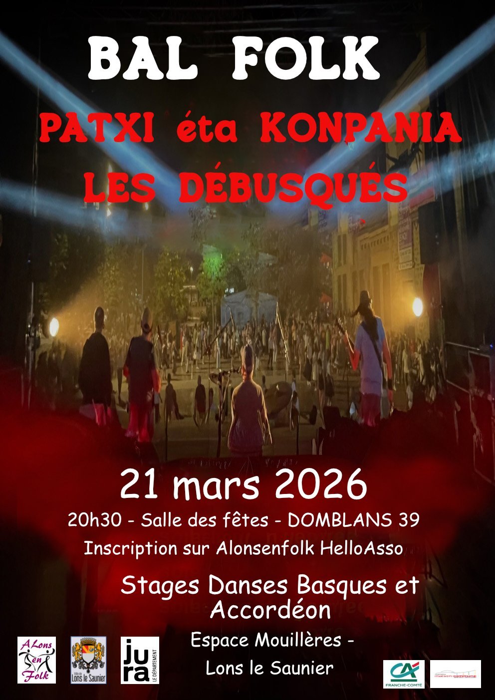 Le samedi 21 mars, à Domblans, ne manquez pas notre belle affiche à notre bal de printemps : PATXI ETA KONPANIA et LES DEBUSQUES.