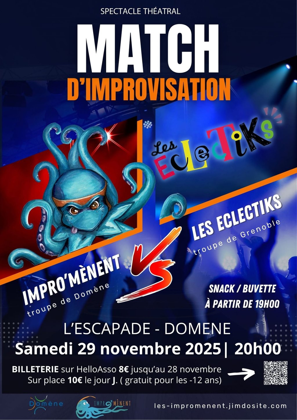 Les Impro'mènent accueillent la troupe grenobloise "Les Eclectiks" pour un match d’impro avec 2 équipes de 5 comédiens et un arbitre.