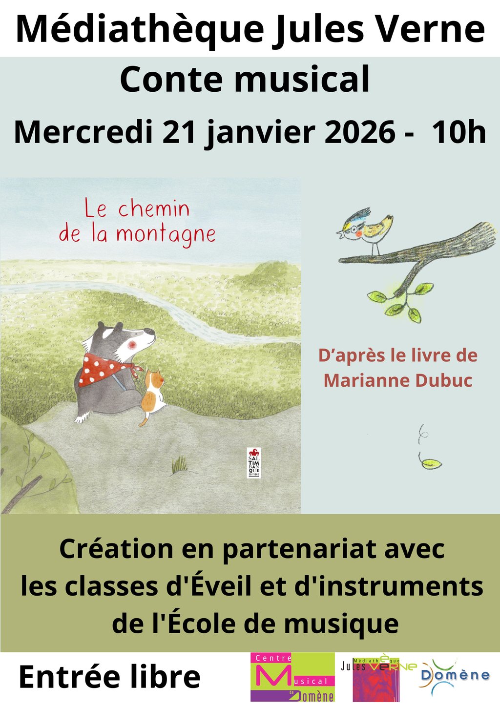Venez assister à ce conte musical, créé en partenariat avec les classes d'Éveil de Céline Chambost et les élèves instrumentistes de l'École de musique, et la Médiathèque Jules Verne, autour de l’album « Le chemin de la montagne » de Marianne Dubuc.