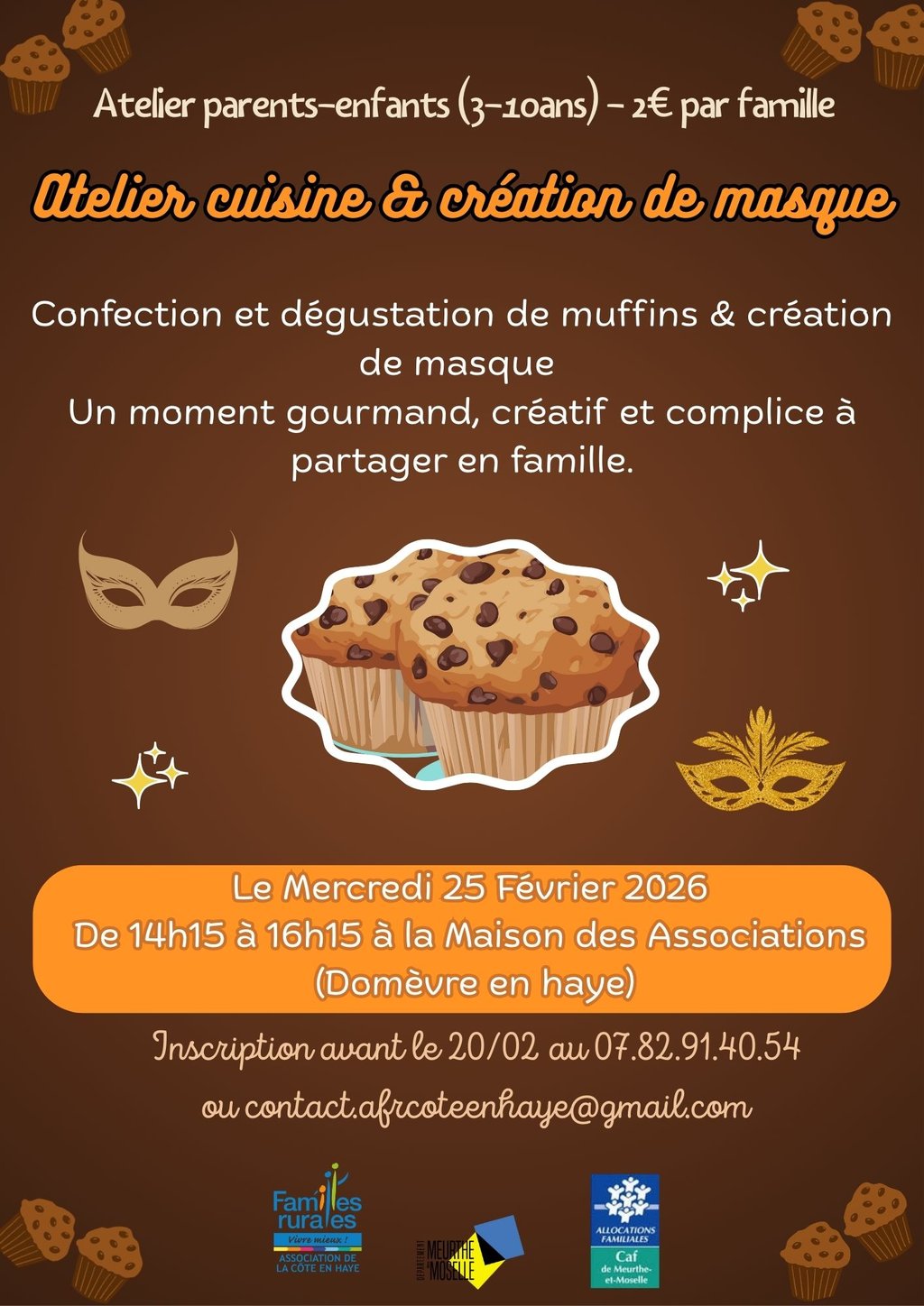 😁 Un moment gourmand, créatif et complice à partager en famille. Venez préparer vos muffins et créer vos masques (carnaval, super héros...) 🤗