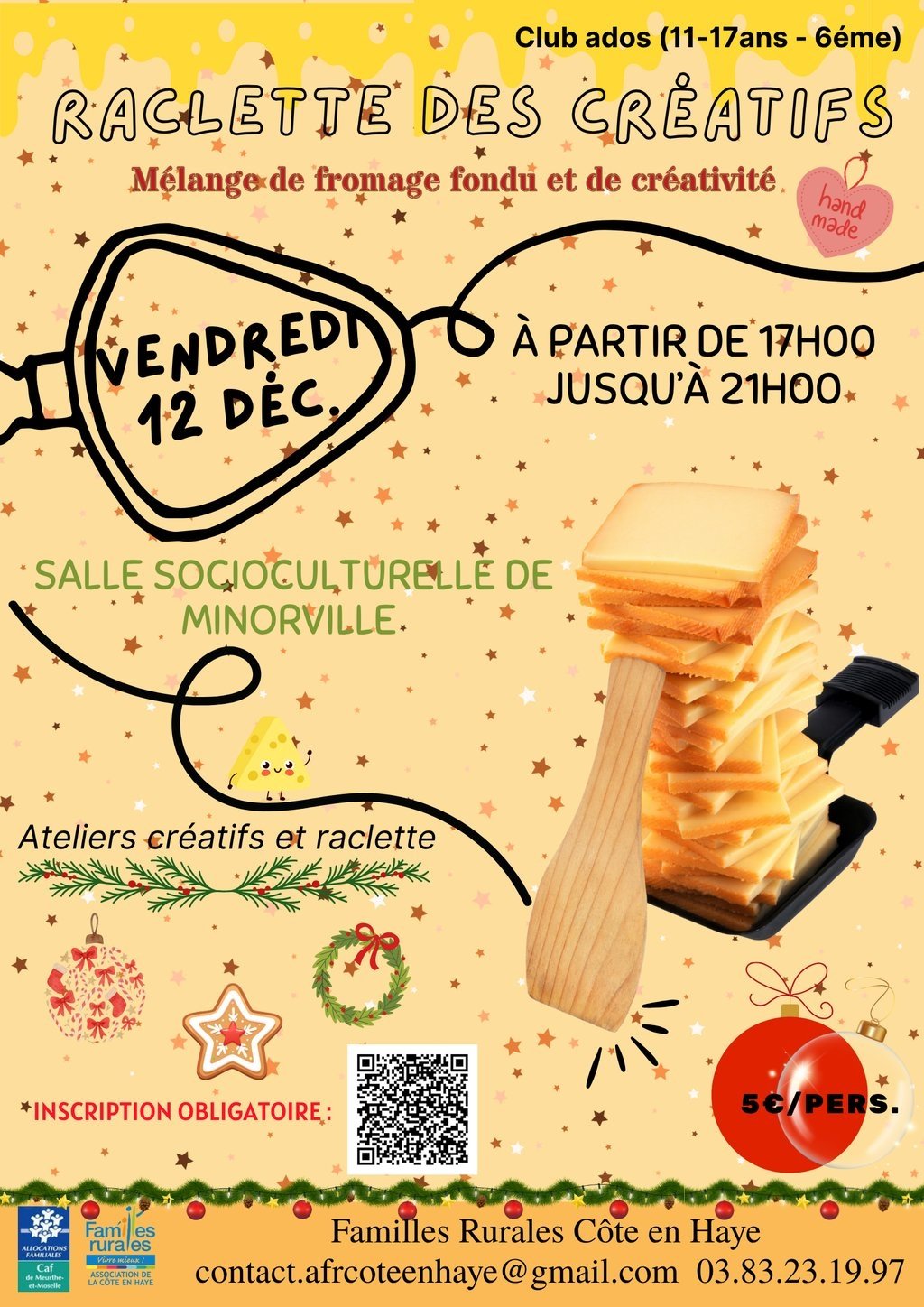 🔗 Inscription obligatoire avant le 9/12 sur HelloAsso : https://www.helloasso.com/associations/familles-rurales-de-la-cote-en-haye/evenements/club-ados-raclette-des-creatifs