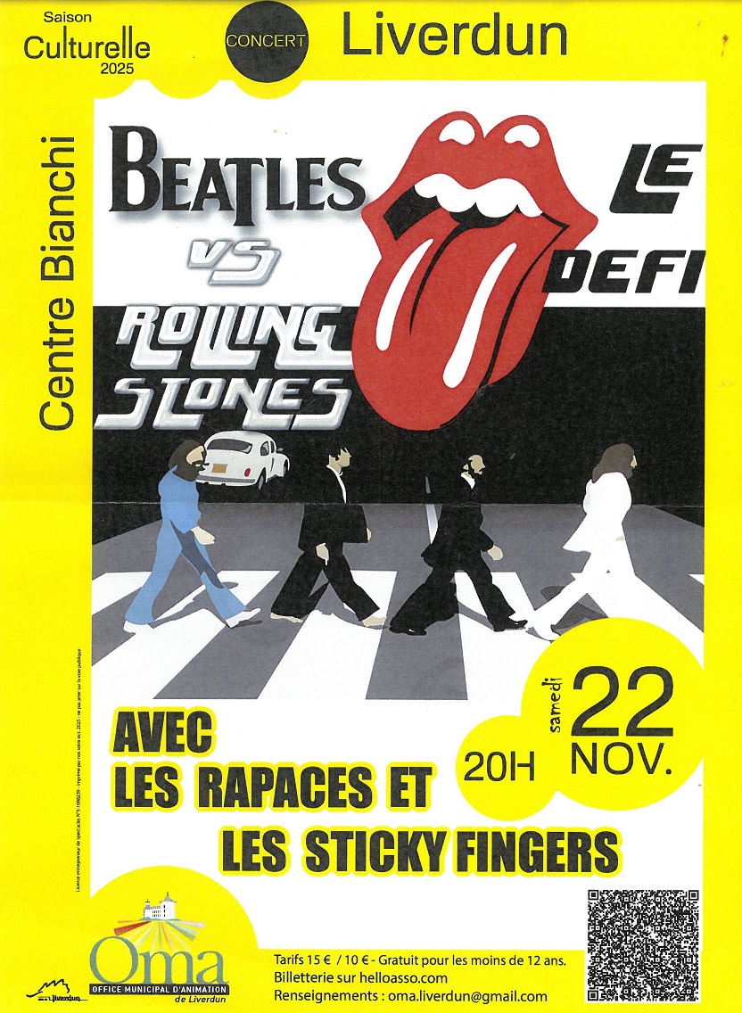 Le samedi 22 novembre à 20h, centre Bianchi à LIVERDUN, concert "Beatles VS Rolling Stones, le Défi".