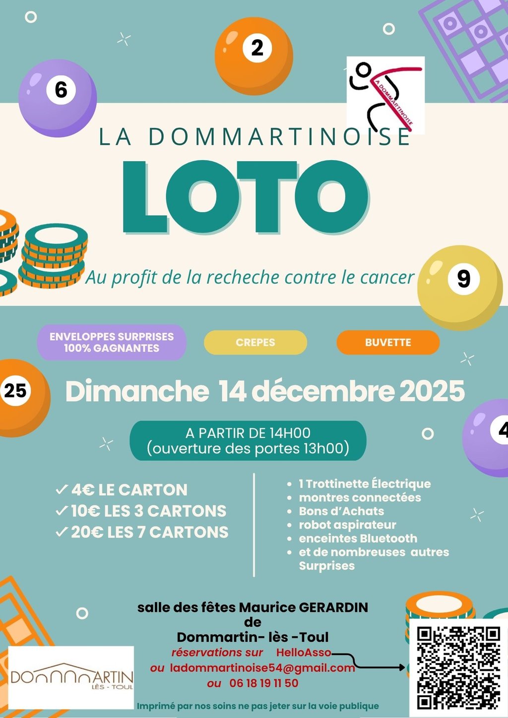 La Dommartinoise organise le dimanche 14 décembre prochain, salle Maurice Gérardin une après-midi LOTO au profit de la lutte contre le cancer, venez nombreux. Les inscriptions seront prises par ”helloasso” ou à l'adresse mail ladommartinoise54@gmail.com ou sur place dès l’ouverture des portes soit à 13 h 30. Les cartons fournis par l’association seront au tarif de :