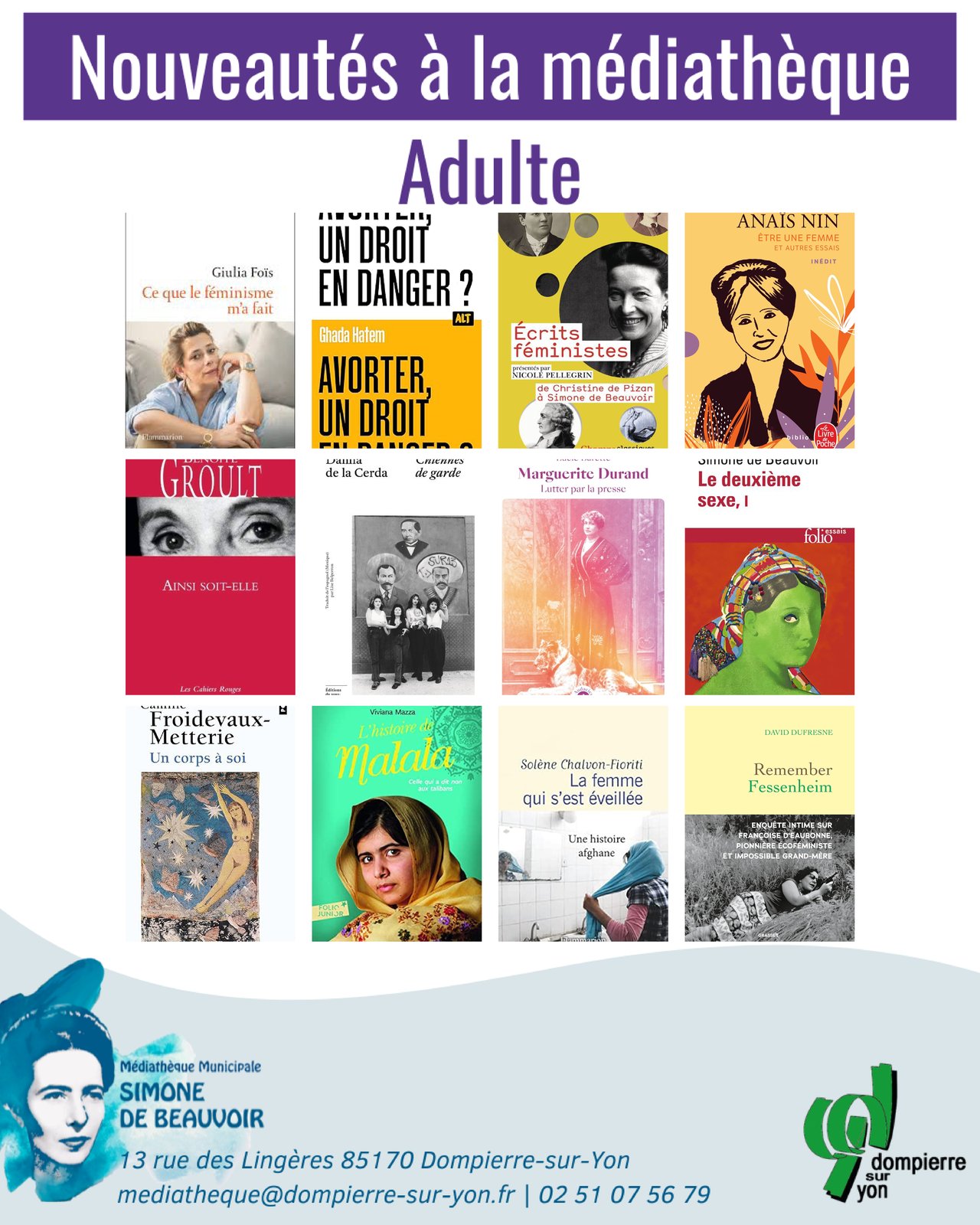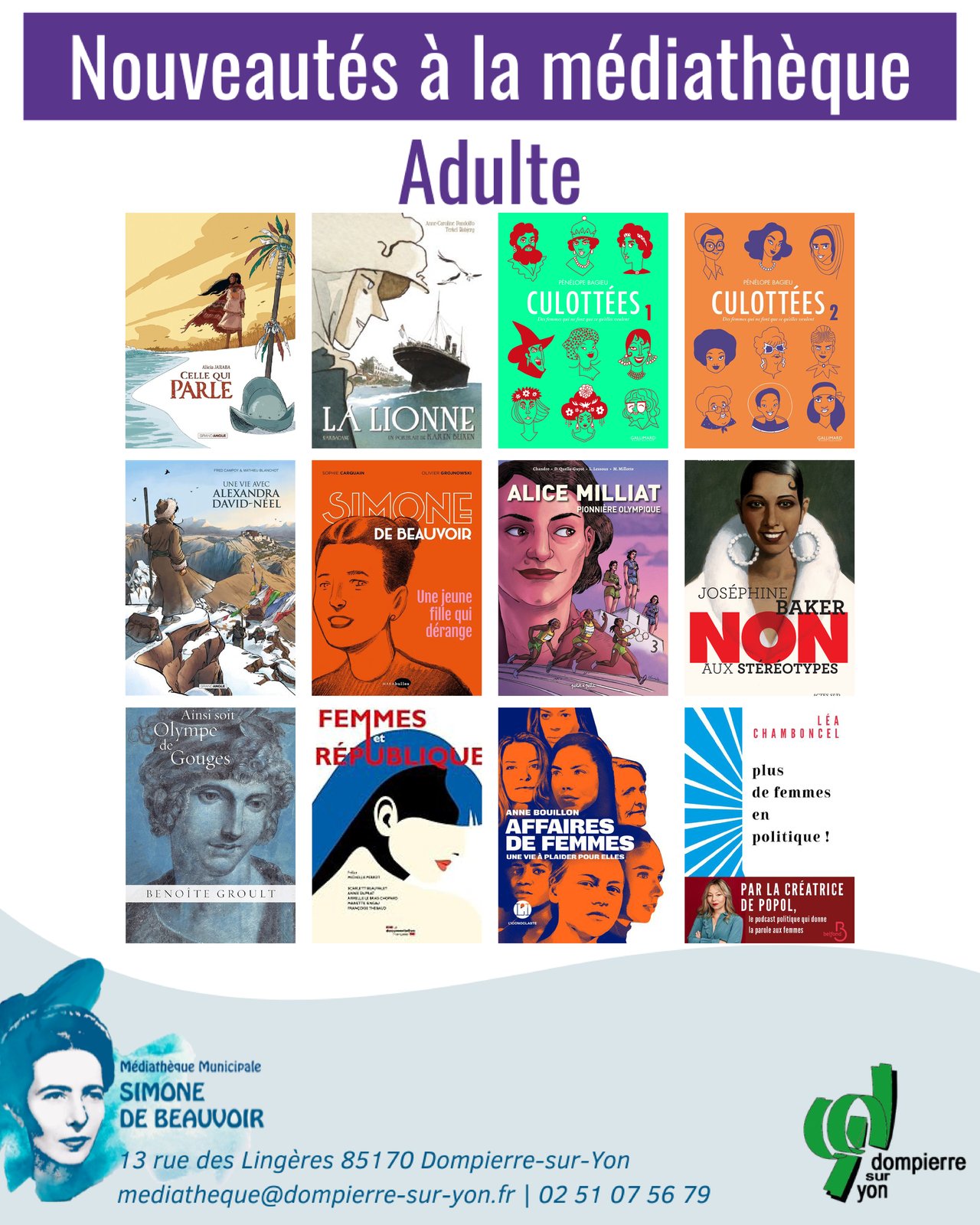 À l’occasion du 8 mars, la médiathèque municipale Simone de Beauvoir vous propose 50 portraits de femmes mémorables et une sélection de livres autour des droits des femmes, de l’égalité et des parcours de femmes inspirantes.