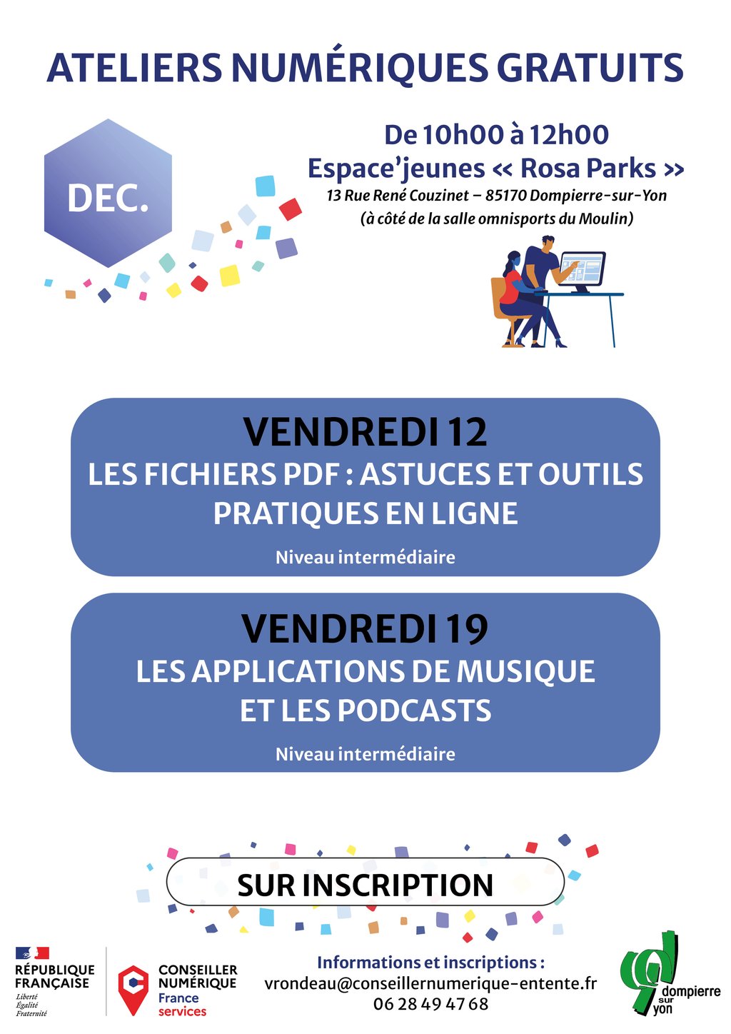 Une conseillère numérique peut vous accompagner à Dompierre-sur-Yon et organise des ateliers par thématique. Prochaine atelier : Les applications de musique et les podcasts