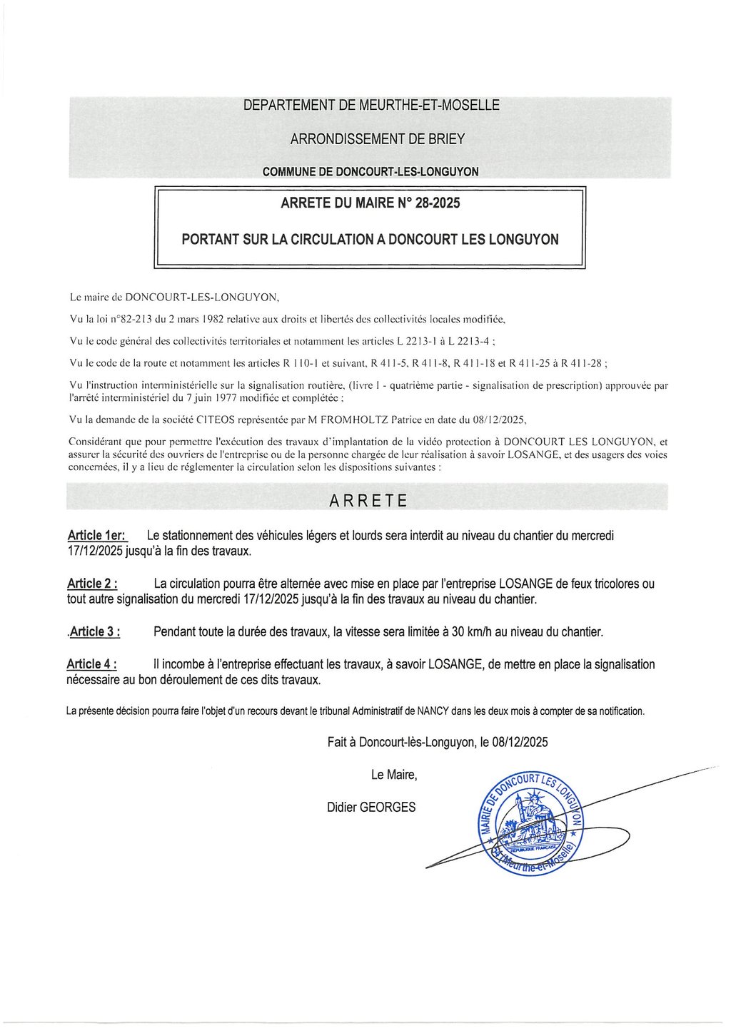 ARRETE DE CIRCULATION - VIDEO PROTECTION