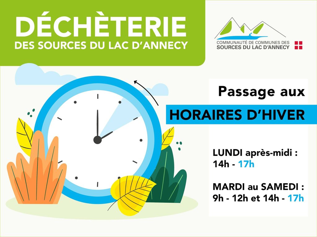 Votre déchèterie des Sources du lac d'Annecy passe aux horaires d'hiver à partir du lundi 27 octobre 2025 et jusqu'au samedi 28 mars 2026.