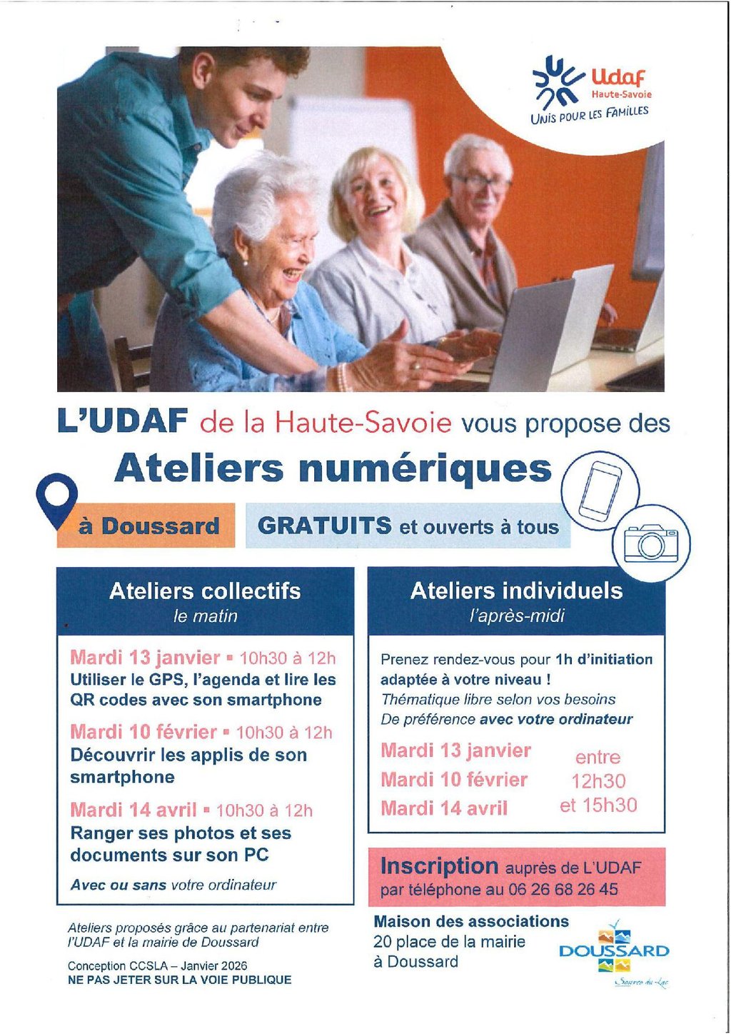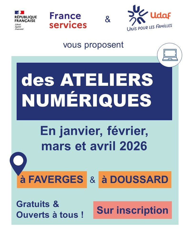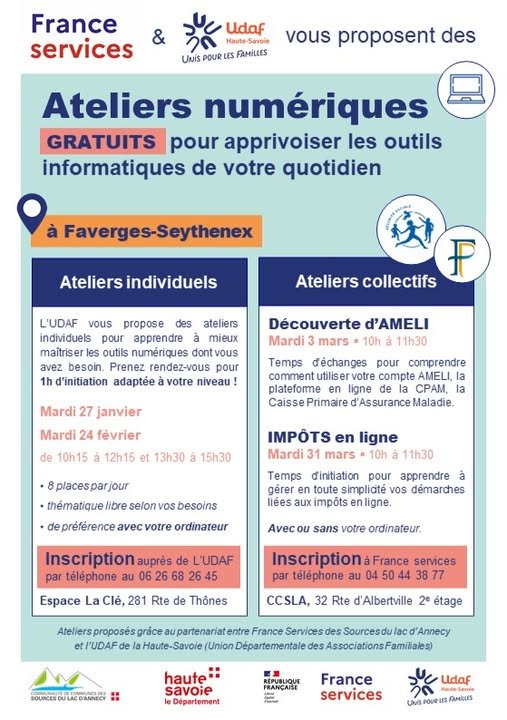 L’une des missions des France Services est de lutter contre la fracture numérique en accompagnant les usagers qui ne sont pas à l’aise avec l’informatique. Pour cela, votre France Services des Sources du lac d’Annecy s’associe à l’UDAF de la Haute-Savoie pour vous proposer des ateliers numériques au cours des prochains mois.