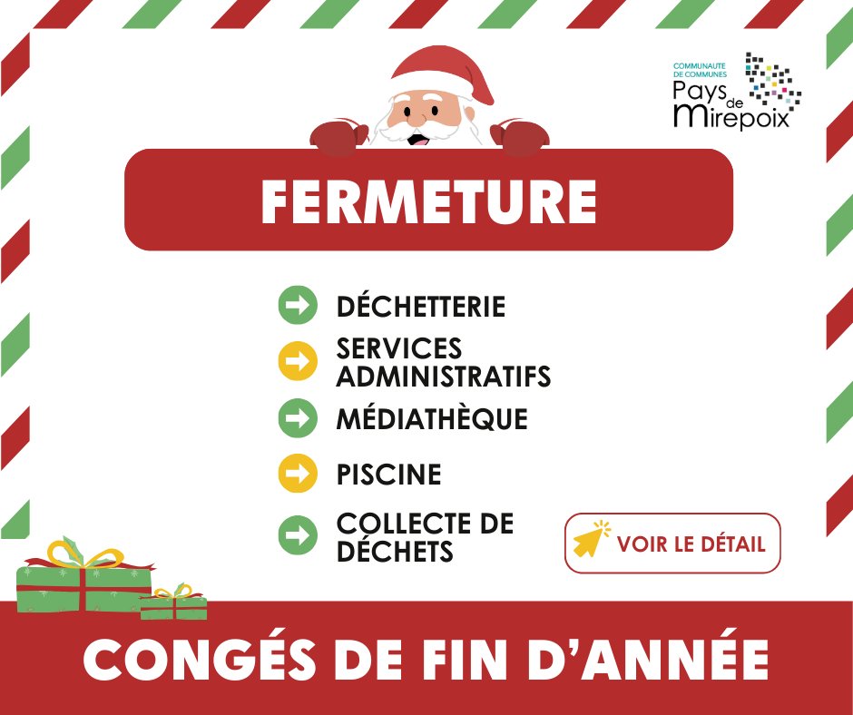 À l’occasion des fêtes de fin d’année, plusieurs services de la Communauté de Communes seront exceptionnellement fermés ou adaptés :