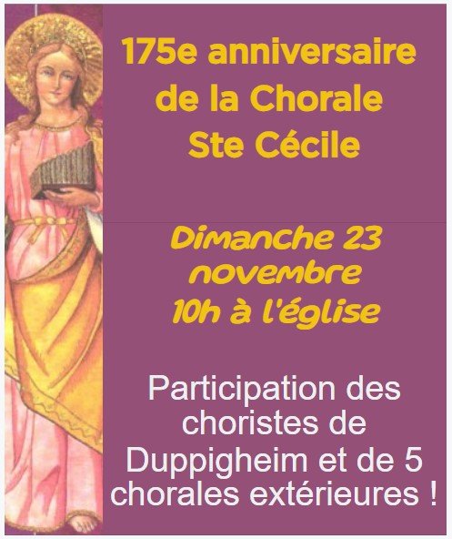 La Chorale a le plaisir de vous inviter à célébrer son 175e anniversaire avec les choristes de Duppigheim et des membres de cinq chorales extérieures, le DIMANCHE 23 NOVEMBRE A 10H A L'EGLISE.