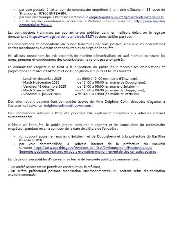 L'enquête, d'une durée de 30 jours minimum se déroulera du LUNDI 1er DECEMBRE 2025 / 9H00 au VENDREDI 16 JANVIER 2026 / 17H inclus en mairies d'Entzheim et DUPPIGHEIM.