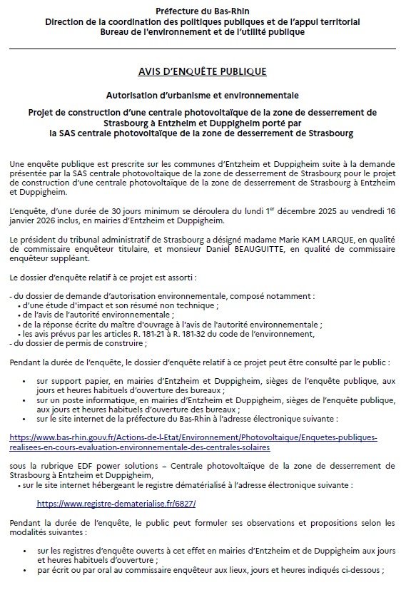 Objet : Demandes d'autorisation d'urbanisme et la demande d'autorisation environnementale relatives au PROJET DE CONSTRUCTION D'UNE CENTRALE PHOTOVOLATIQUE de la zone de desserrement de Strasbourg à Entzheim et Duppigheim porté par la société EDF Power Solutions.